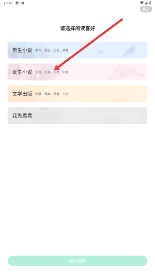 1、進(jìn)入APP先看到閱讀喜好選擇界面,有男生小說、女生小說、文學(xué)出版等分類,也可選擇我先看看,選好后點(diǎn)確認(rèn)選擇。