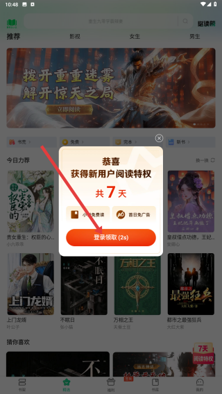 2、選好喜好進(jìn)入推薦頁(yè)面,會(huì)彈出恭喜獲得新用戶閱讀特權(quán)共7天的窗口,點(diǎn)擊登錄領(lǐng)取,進(jìn)入登錄界面。