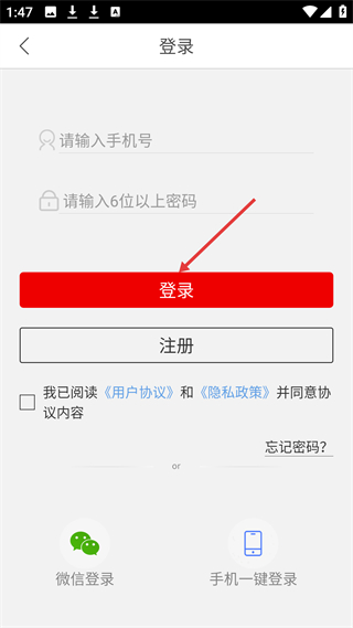 1、登錄界面可輸入手機(jī)號、密碼登錄,也可選擇注冊或微信、手機(jī)一鍵登錄,登錄前需勾選同意用戶協(xié)議和隱私政策。
