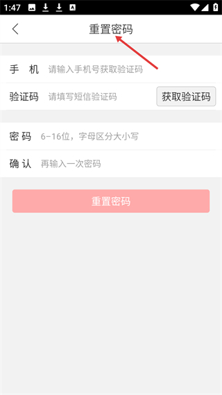 3、重置密碼界面,需輸入手機(jī)號獲取驗(yàn)證碼,設(shè)置新的6、16位區(qū)分大小寫的密碼并確認(rèn),完成后點(diǎn)擊重置密碼即可。