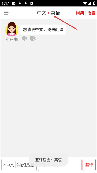 4、界面支持中文到英語翻譯,有小秘書功能可語音翻譯,還可切換詞典、語言設(shè)置,滿足語言互譯需求。