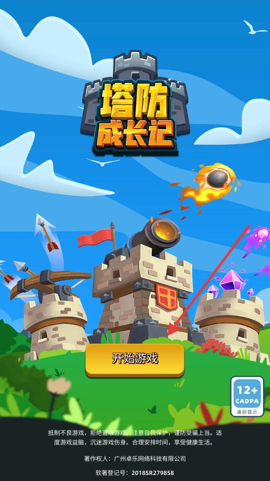 1、游戲開始界面,展示了城堡防御的主題,火炮發(fā)射炮彈的場景很有戰(zhàn)斗感,開始游戲按鈕等待玩家點(diǎn)擊。