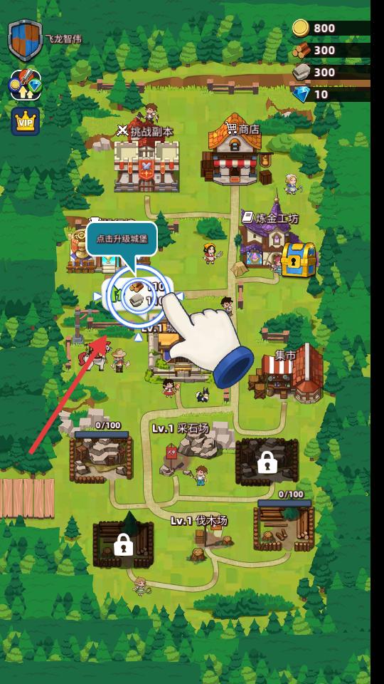 2、地圖界面中各類建筑分布在綠色的森林場景里,手指指引玩家點(diǎn)擊城堡進(jìn)行升級,上方顯示著金幣、木材等資源數(shù)量。