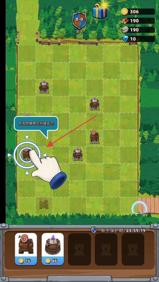 4、戰(zhàn)場界面中布置好的防御塔等待升級,提示點(diǎn)擊防御塔可升級實(shí)力,手指指向塔,方便玩家進(jìn)行升級操作來增強(qiáng)戰(zhàn)力。