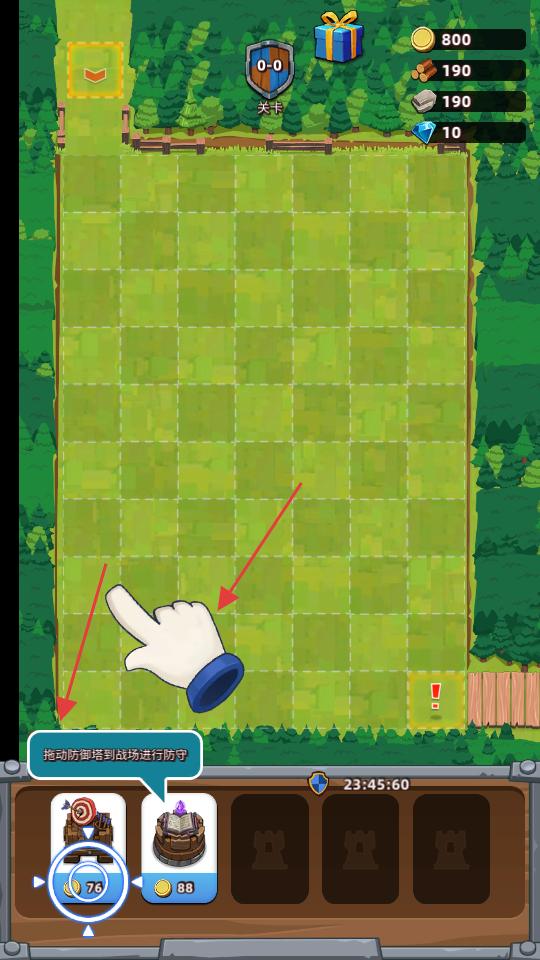 3、游戲的塔防戰(zhàn)場,綠色的方格場地等待布置防御塔,下方的防御塔選擇欄有不同塔型,提示拖動防御塔到戰(zhàn)場進(jìn)行防守。