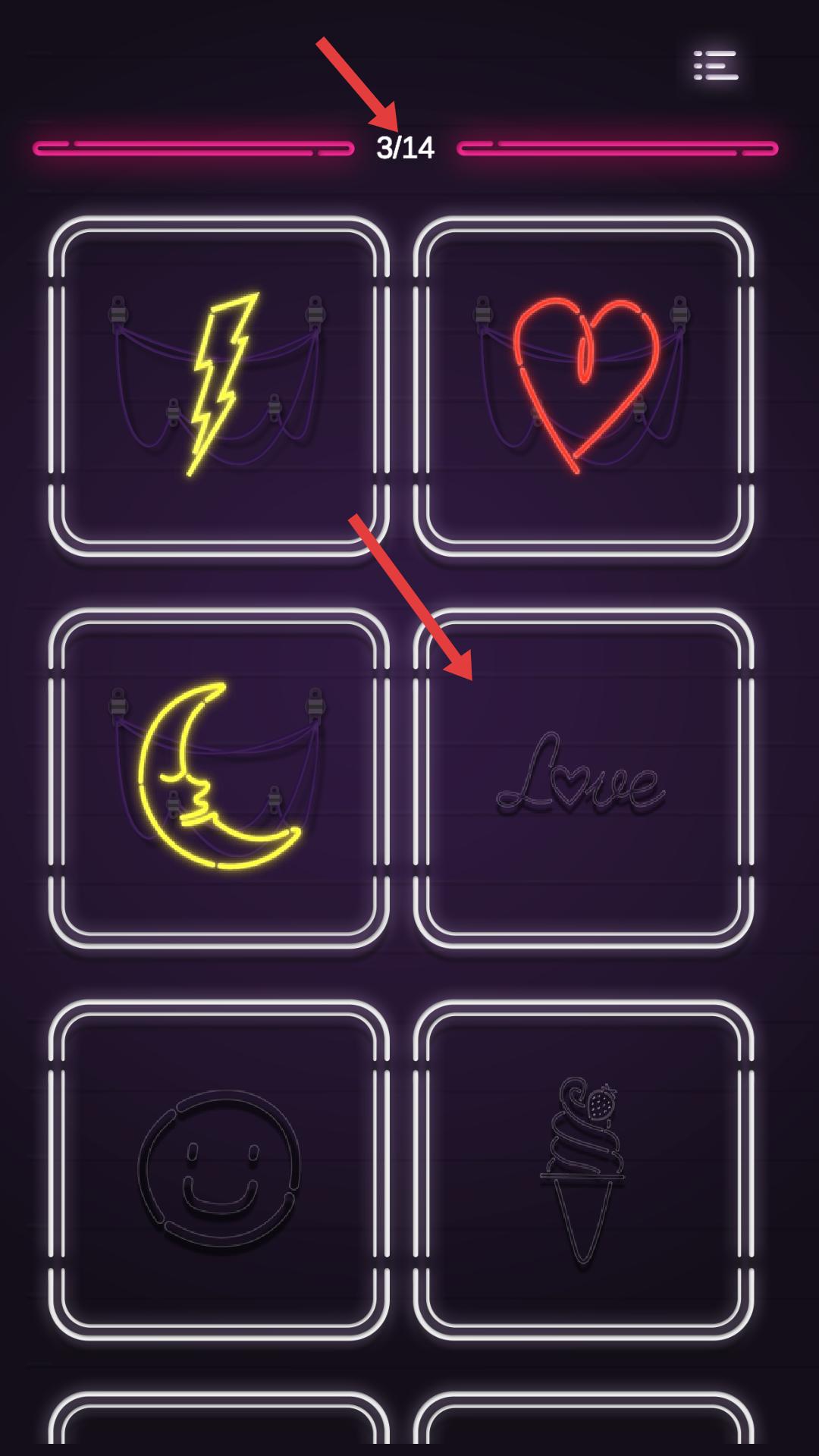 2、界面顯示多個帶有霓虹圖案的方塊,選擇其中一個方塊,進入該圖案的拼圖環(huán)節(jié),準備開始拼對應(yīng)的霓虹圖案。