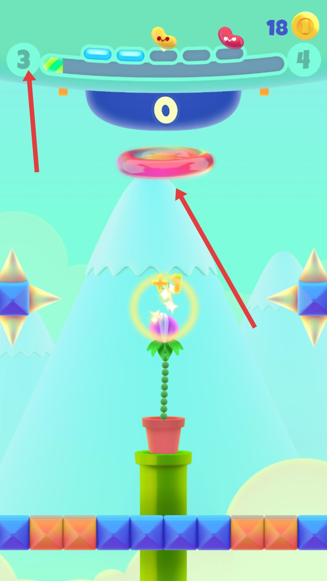 4、植物生長到一定階段會出現(xiàn)傳送環(huán)等元素,利用這些元素讓植物繼續(xù)向上生長,提升生長的高度,挑戰(zhàn)更高的關(guān)卡。