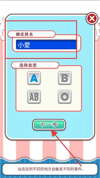 3、為小女孩起好名字接著在血型選擇區(qū)域,從A、B、AB、O四種血型中挑選合適的,選好后點擊下一步按鈕。