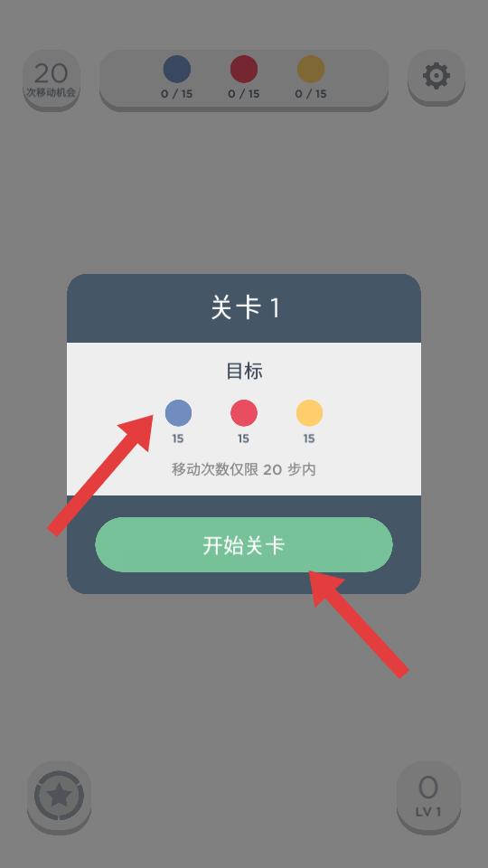 3、關(guān)卡1中,目標是收集一定數(shù)量的藍,紅,黃點,且移動次數(shù)僅限20步內(nèi),點擊開始關(guān)卡按鈕,正式開始關(guān)卡挑戰(zhàn)。