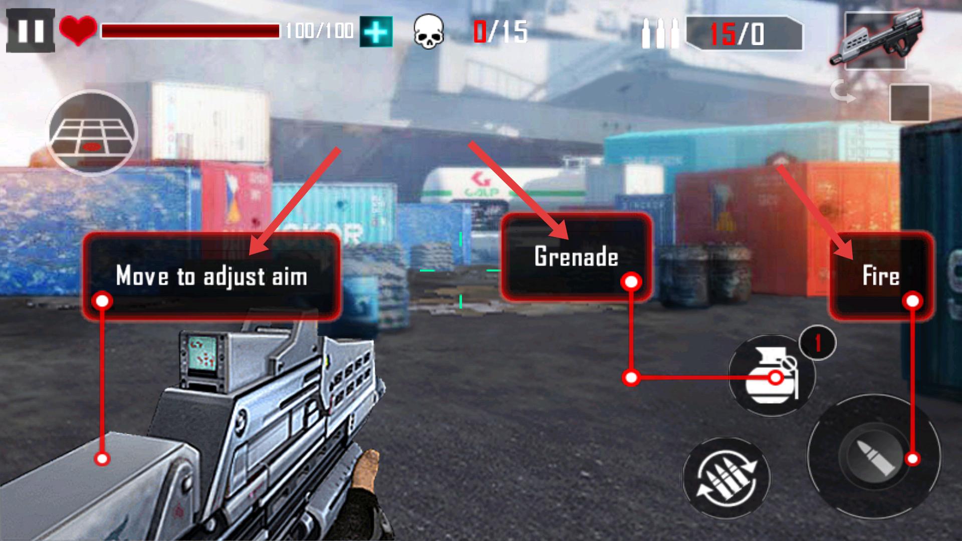 2、游戲中通過移動調整瞄準,使用槍械射擊僵尸,也可投擲手榴彈,大范圍打擊敵人,注意利用場景中的掩體,保護自身安全。
