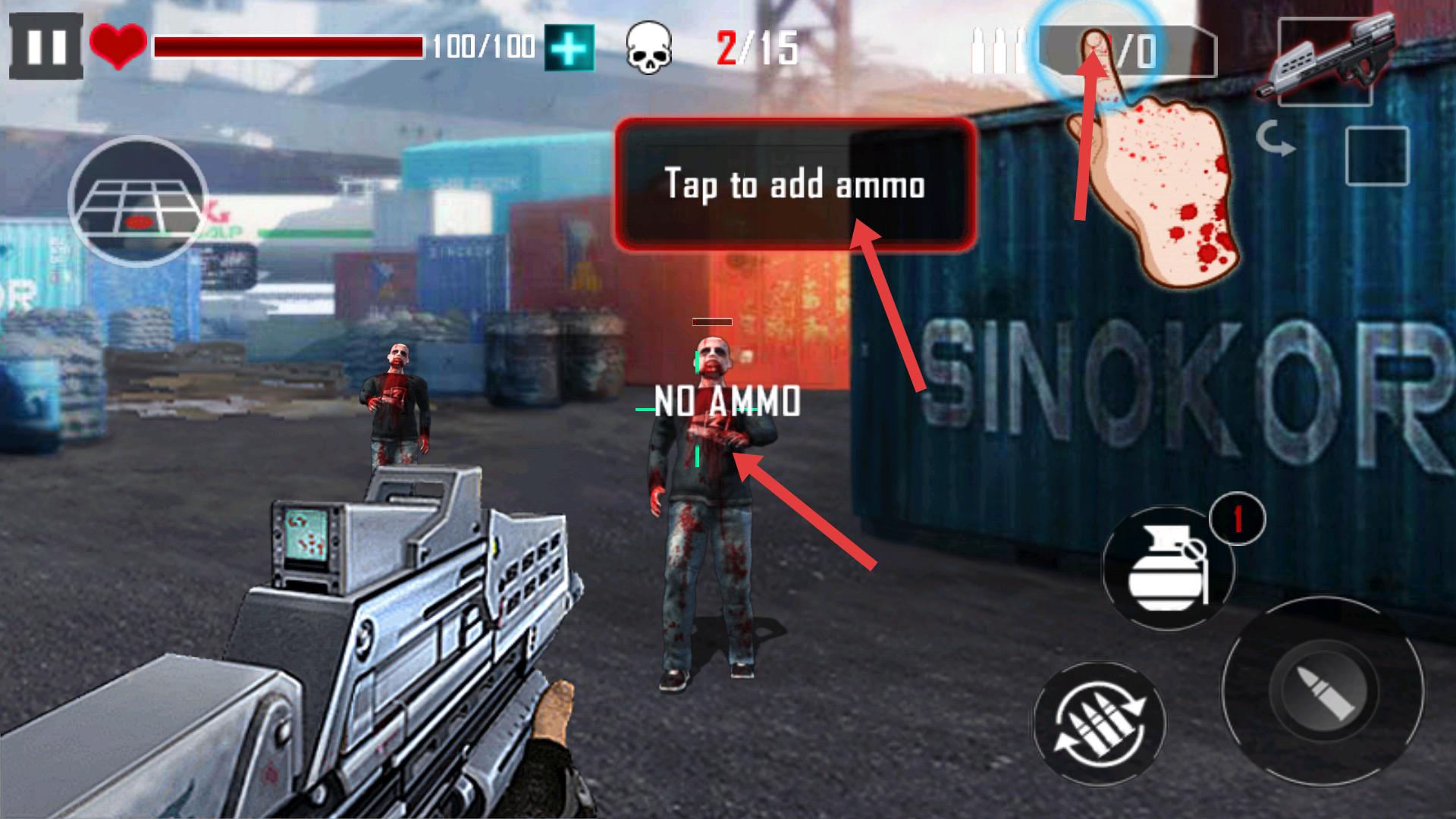 3、當槍械顯示沒有彈藥時點擊提示區(qū)域添加彈藥,確保有足夠火力持續(xù)打擊僵尸,避免因彈藥不足陷入危險。