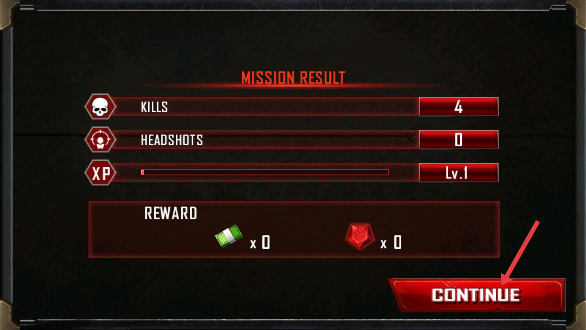 4、任務結束界面顯示任務結果,包含擊殺數(shù)、爆頭數(shù)等,點擊紅色CONTINUE按鈕,繼續(xù)下一個任務,積累經(jīng)驗提升等級。