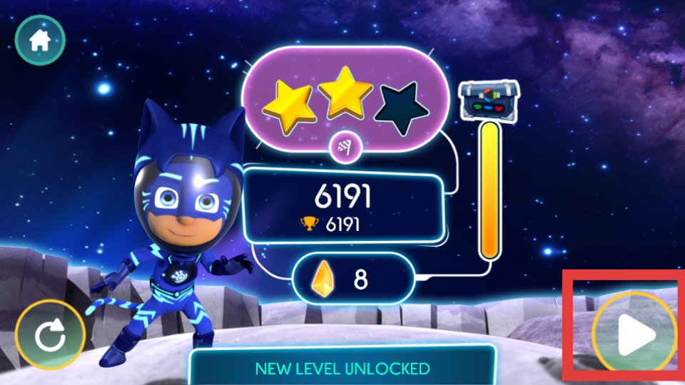 3、抵達關卡終點后根據(jù)玩家的表現(xiàn)會獲得相應的星級評價,點擊右下方的播放按鈕,可以繼續(xù)挑戰(zhàn)新的關卡。