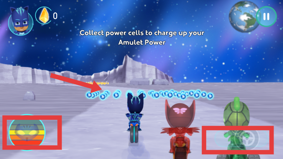 2、進入游戲后通過屏幕左右兩側的操控按鈕來控制角色賽車的方向,在賽道上行駛時收集藍色的能量電池,以此來為護身符能量充電,獲取特殊能力或加速效果。