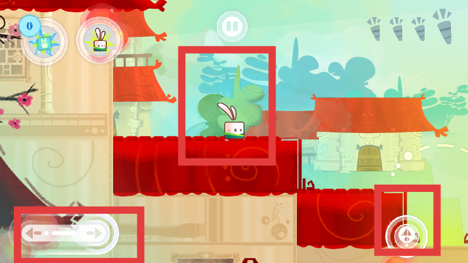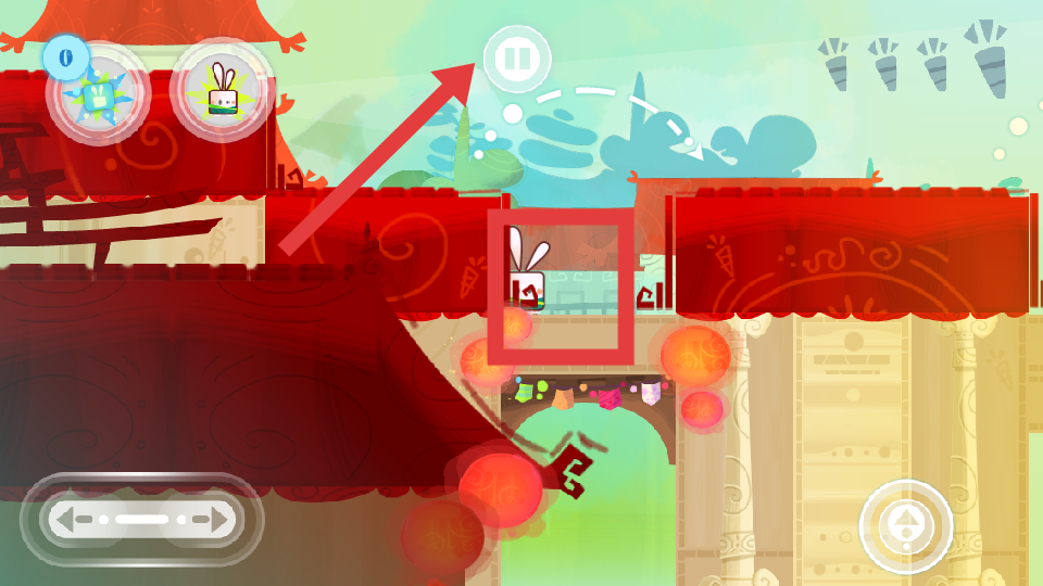 3、在游戲過程中兔子會遇到各種敵人和復(fù)雜地形,點擊屏幕左上方的技能按鈕,可以釋放功夫技能攻擊敵人,游戲里面可點擊箭頭標(biāo)記隨時重新開始。