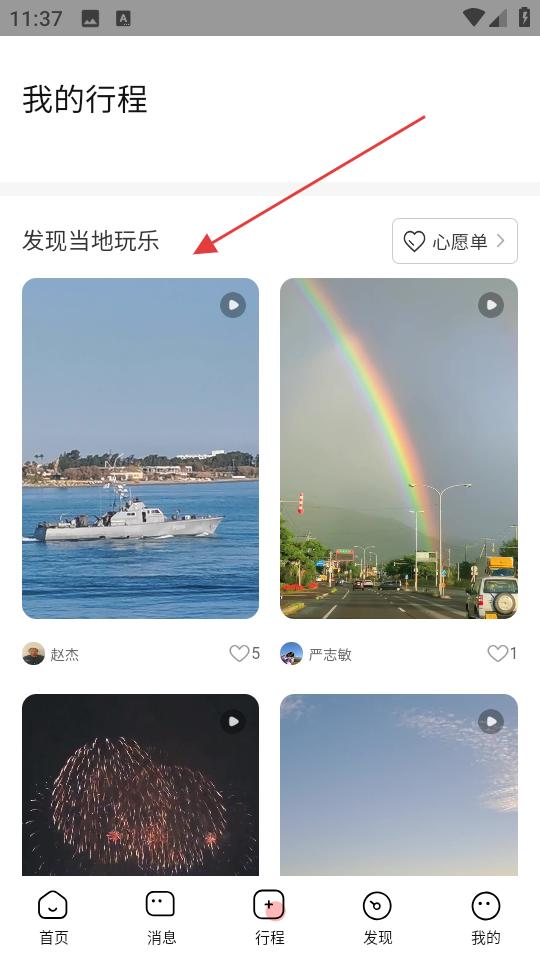 2、切換至行程頁面,查看我的行程,在發(fā)現(xiàn)當(dāng)?shù)赝鏄钒鍓K瀏覽用戶分享的當(dāng)?shù)赜瓮鎯?nèi)容,了解旅行目的地特色。