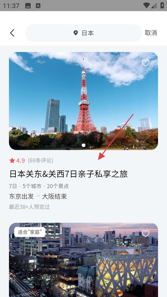 3、進(jìn)入搜索頁,輸入日本查找相關(guān)行程,選擇日本關(guān)東關(guān)西7日親子私享之旅,查看行程詳情、預(yù)定人數(shù)等信息。