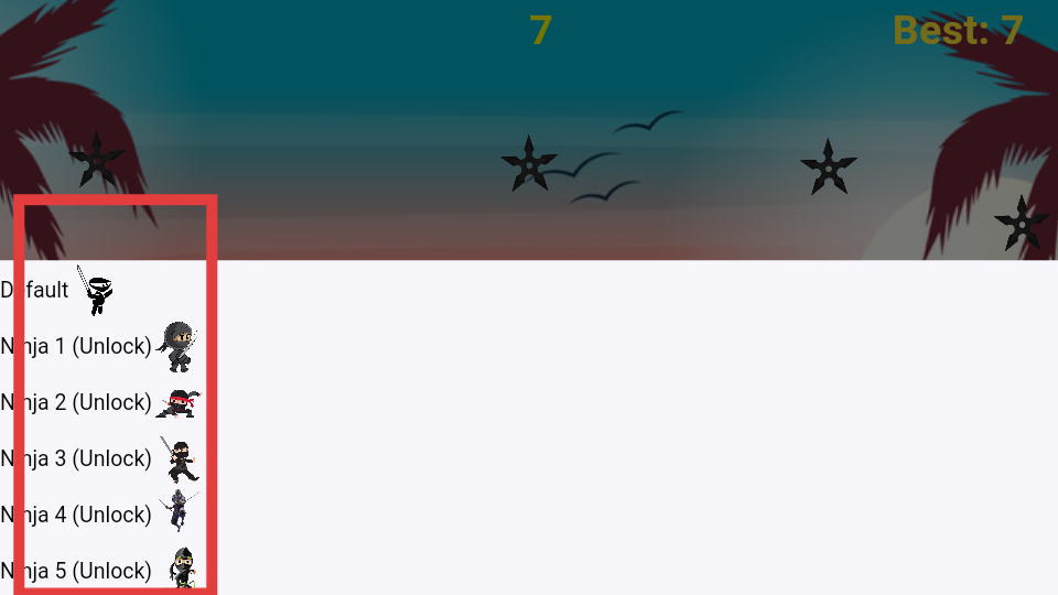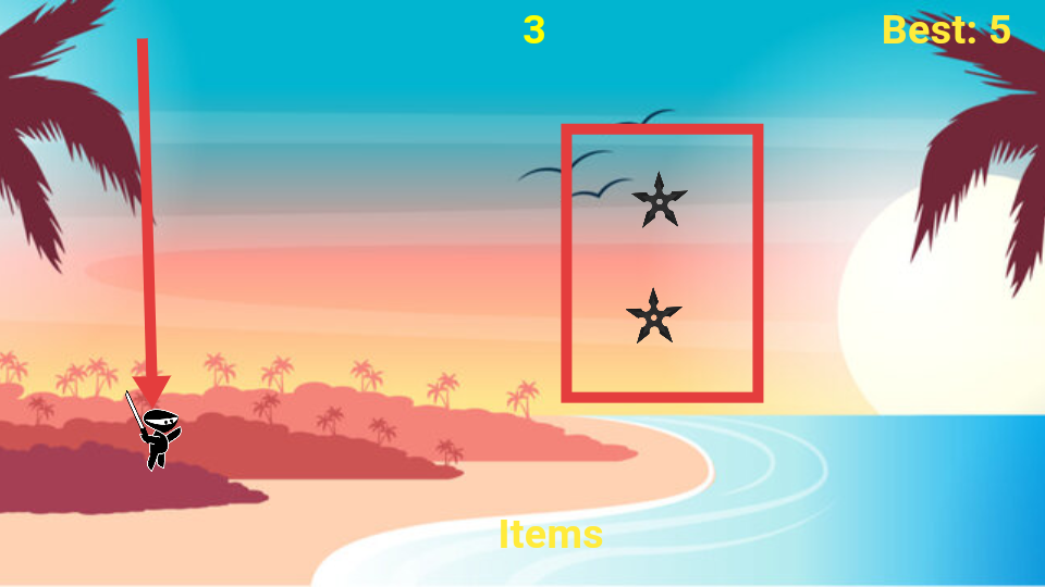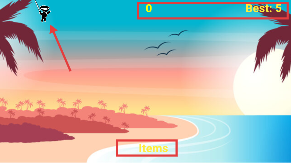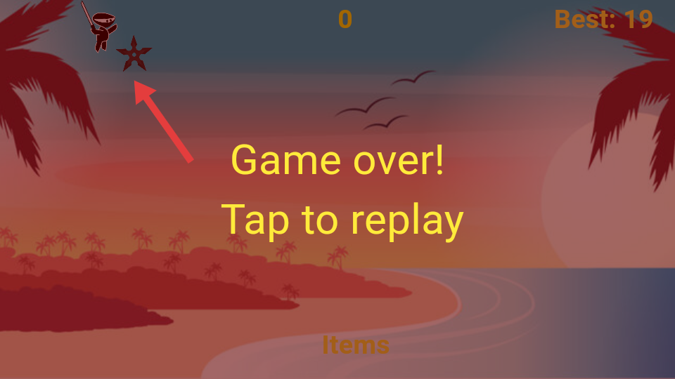 1、游戲開(kāi)始忍者處于空中,上方顯示當(dāng)前分?jǐn)?shù)與最佳分?jǐn)?shù),下方有Items選項(xiàng),可先熟悉界面為后續(xù)操作做準(zhǔn)備。