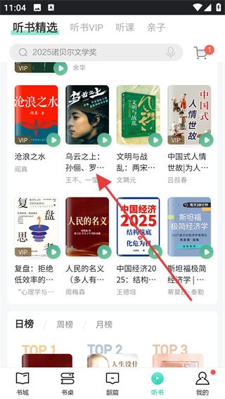 1、瀏覽聽書精選板塊下的滄浪之水、烏云之上、文明與戰(zhàn)亂等書籍,了解書籍的題材與作者,挑選感興趣的聽書內(nèi)容。