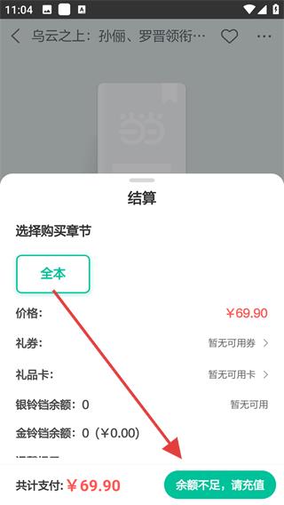 3、若想購(gòu)買書籍可選擇購(gòu)買章節(jié),如全本查看書籍的價(jià)格,若余額不足,可進(jìn)行充值操作。