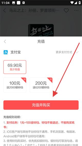 4、在充值頁(yè)面選擇支付寶等支付方式,選擇充值金額,點(diǎn)擊充值并購(gòu)買,完成書籍的購(gòu)買流程,享受完整的聽書體驗(yàn)。