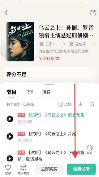 2、進(jìn)入書籍詳情頁(yè)可點(diǎn)擊免費(fèi)試聽,體驗(yàn)書籍的部分音頻內(nèi)容,判斷是否符合聽書需求。