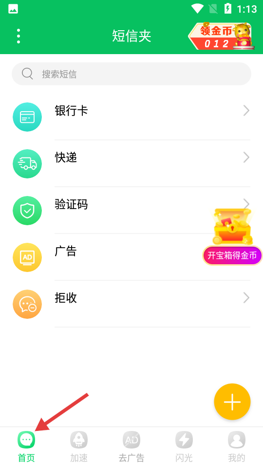 1、首頁綠色背景設(shè)有搜索框,將短信分類為銀行卡、快遞等,右上角有領(lǐng)金幣提示,底部有功能欄。