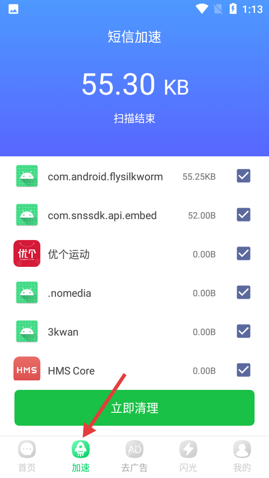 2、短信加速頁面掃描后顯示各應(yīng)用占用空間,如com.android.flysilkworm等,可點擊立即清理釋放空間。