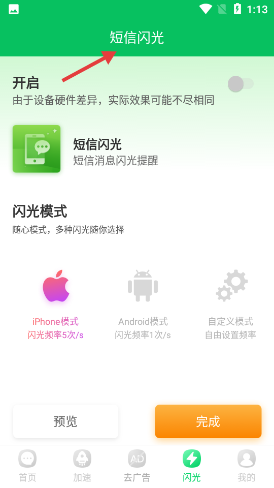 3、短信閃光界面可開啟短信閃光提醒,提供iPhone、Android等閃光模式,支持預(yù)覽和自定義設(shè)置,方便個性選擇。