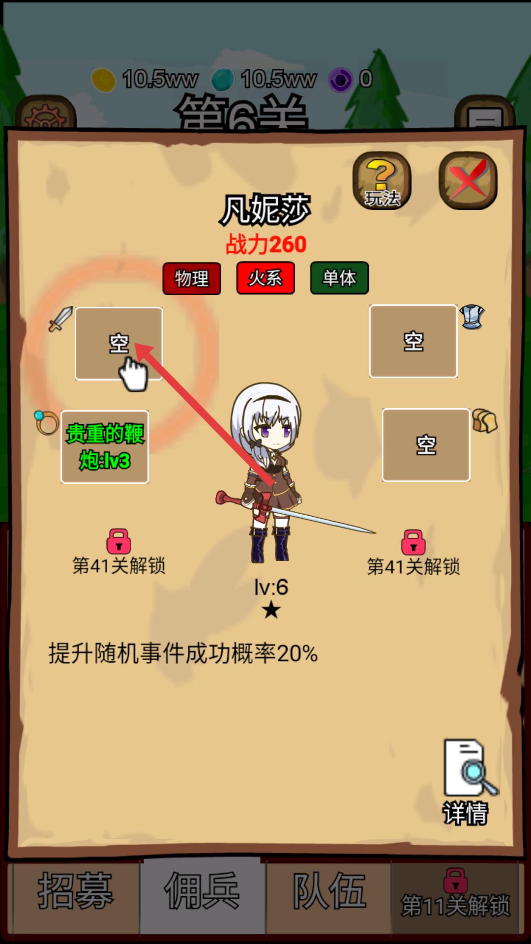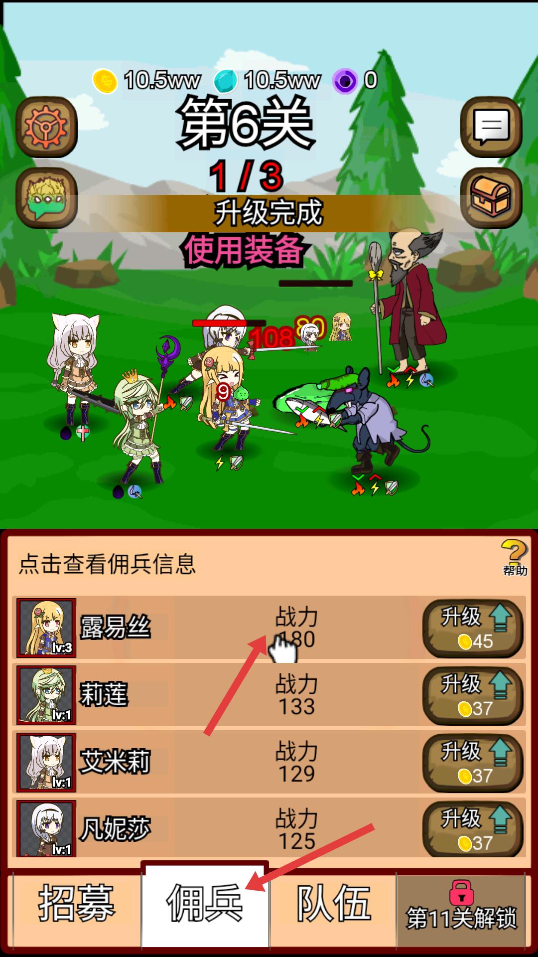 2、進(jìn)入游戲后,在第6關(guān)界面,點(diǎn)擊傭兵選項(xiàng),可查看露易絲、莉蓮等傭兵的戰(zhàn)力信息,還能對(duì)傭兵進(jìn)行升級(jí)操作,提升戰(zhàn)力。
