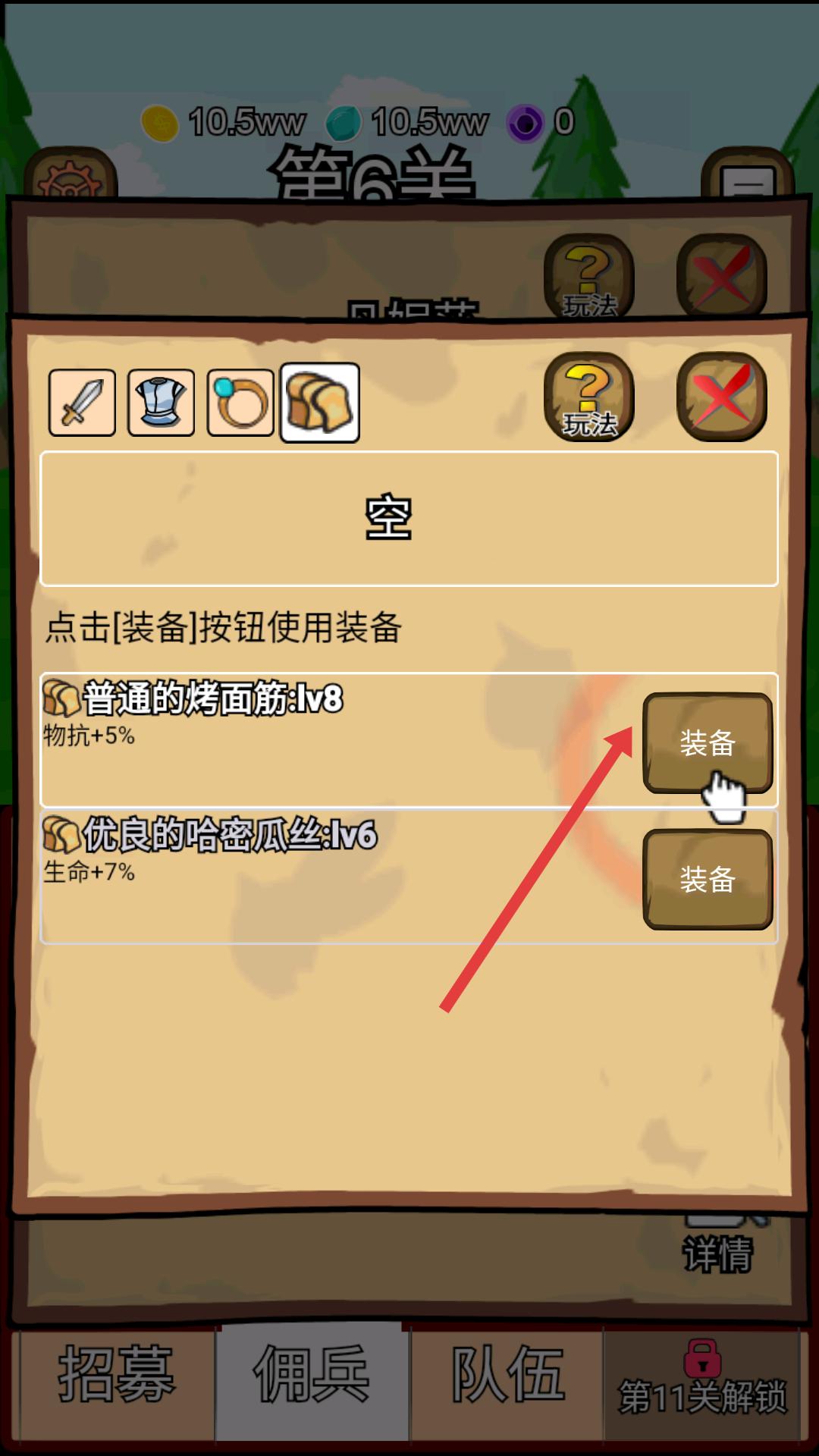 4、在裝備選擇界面,有普通的烤面筋、優(yōu)良的哈密瓜絲等裝備,點(diǎn)擊裝備對(duì)應(yīng)的裝備按鈕,可將裝備佩戴到傭兵身上,提升傭兵屬性。