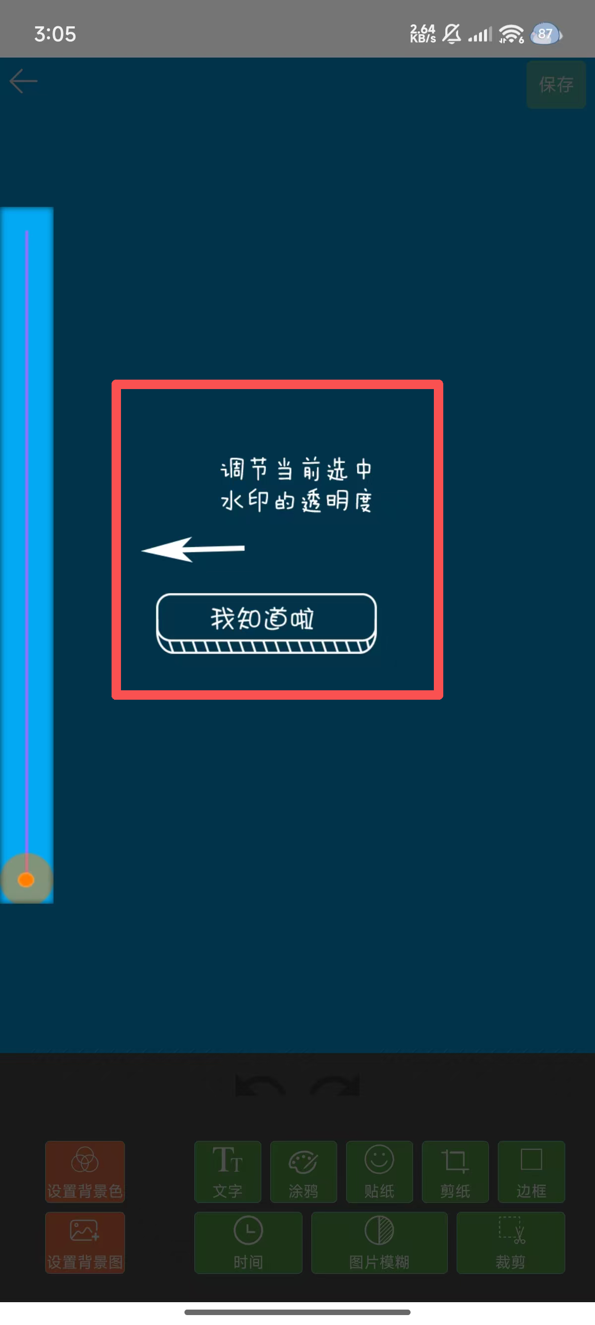 1、點(diǎn)擊圖片文字按鈕,進(jìn)入編輯界面,首先會(huì)看到調(diào)節(jié)當(dāng)前選中水印透明度的提示,點(diǎn)擊我知道啦繼續(xù)操作。