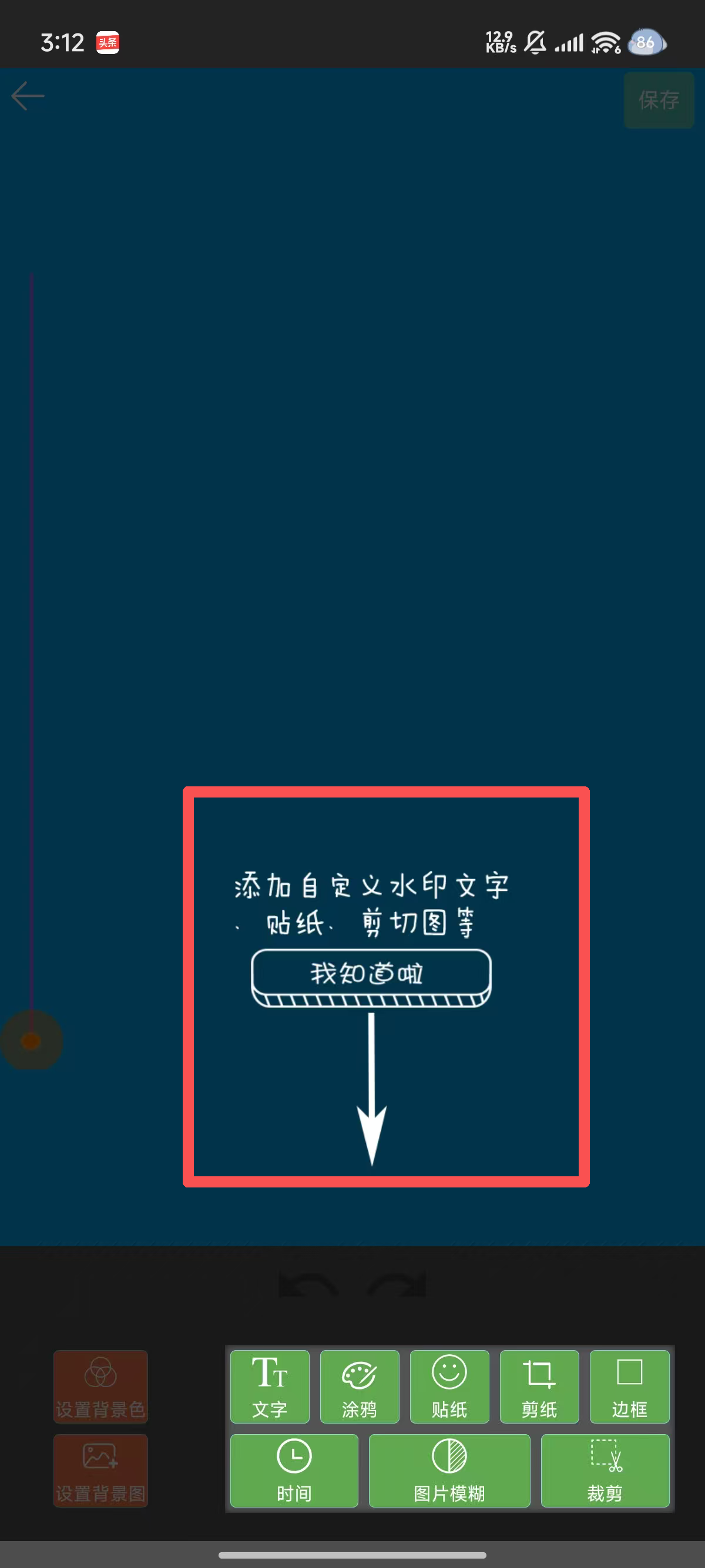 3、然后會(huì)有添加自定義水印文字、貼紙、剪切圖等的提示,點(diǎn)擊我知道啦,開始進(jìn)行這些元素的添加。