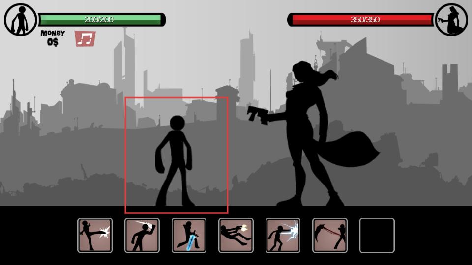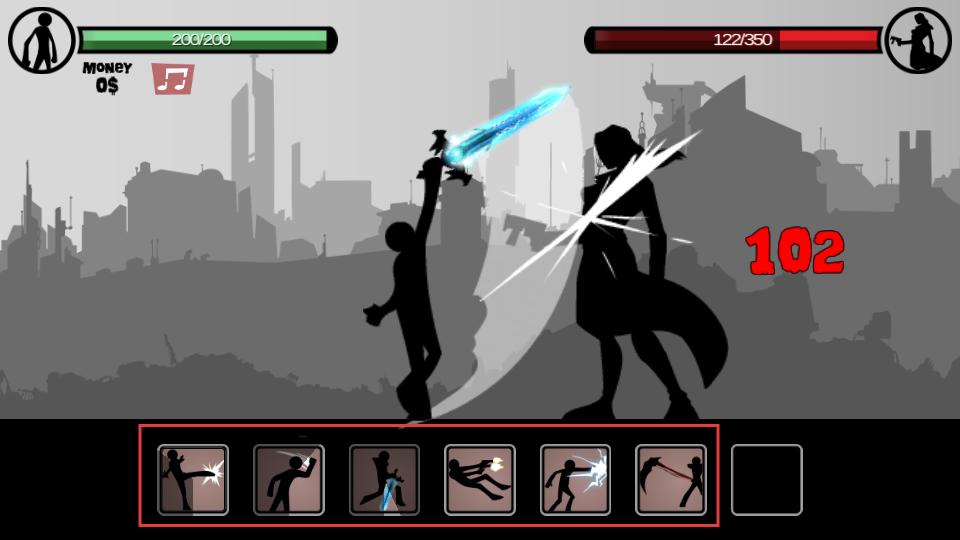 1、進(jìn)入游戲后,操控火柴人,在屏幕下方眾多技能圖標(biāo)里,點擊選擇合適的技能,然后朝著對手發(fā)起攻擊,要注意觀察對手動作,找好出手時機。