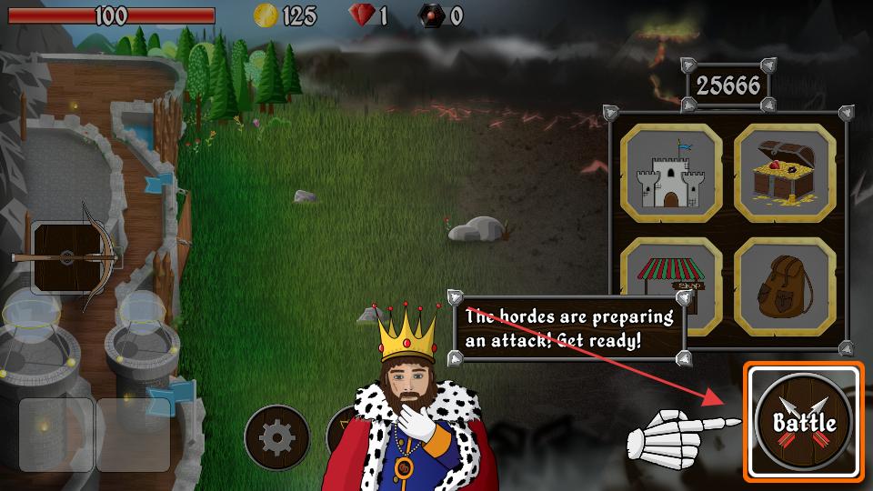 1、國王形象的角色提示獸群正準(zhǔn)備進(jìn)攻,做好準(zhǔn)備,右側(cè)有城堡、寶箱等功能圖標(biāo),還有Battle按鈕可進(jìn)入戰(zhàn)斗。