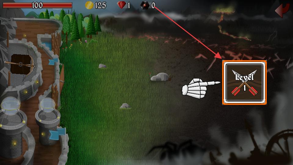 2、界面顯示當(dāng)前為level1第一關(guān),有血量、金幣等數(shù)值,手指指向關(guān)卡標(biāo)識,提示進(jìn)入第一關(guān)戰(zhàn)斗。