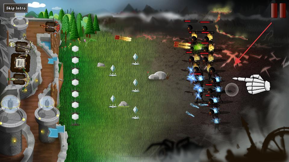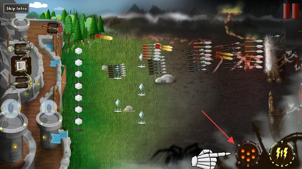 3、游戲戰(zhàn)斗場景中我方城堡的防御裝置正發(fā)射攻擊,對抗右側(cè)襲來的敵方部隊(duì),畫面還有Skip Intro跳過開場的選項(xiàng)。