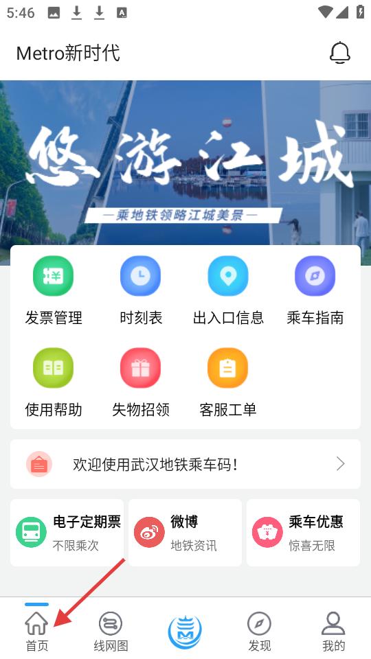 1、點擊首頁,展示悠游江城主題,集成發(fā)票管理等功能,推廣武漢地鐵乘車碼,還有電子定期票服務(wù)。