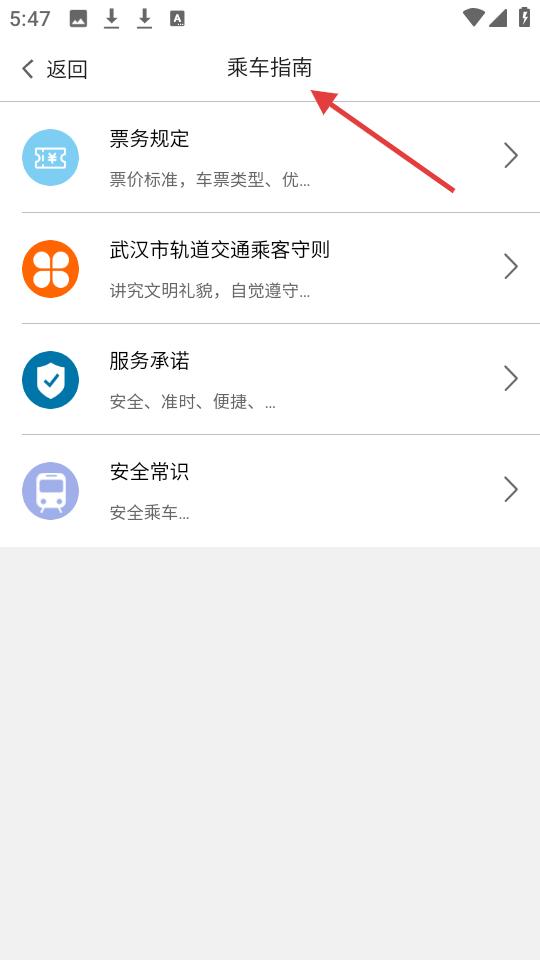 2、點擊乘車指南頁,羅列票務(wù)規(guī)定、乘客守則等內(nèi)容,為乘客提供全面的乘車規(guī)范與安全常識等信息。