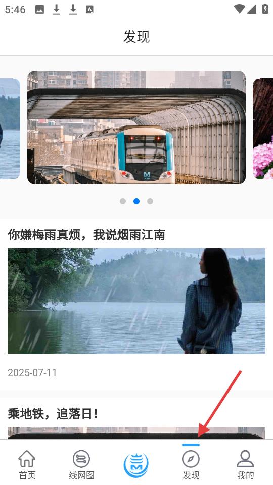 3、點擊發(fā)現(xiàn)界面,推送地鐵相關(guān)圖文,如乘地鐵,追落日等文章,分享地鐵出行的美好體驗與風(fēng)景。