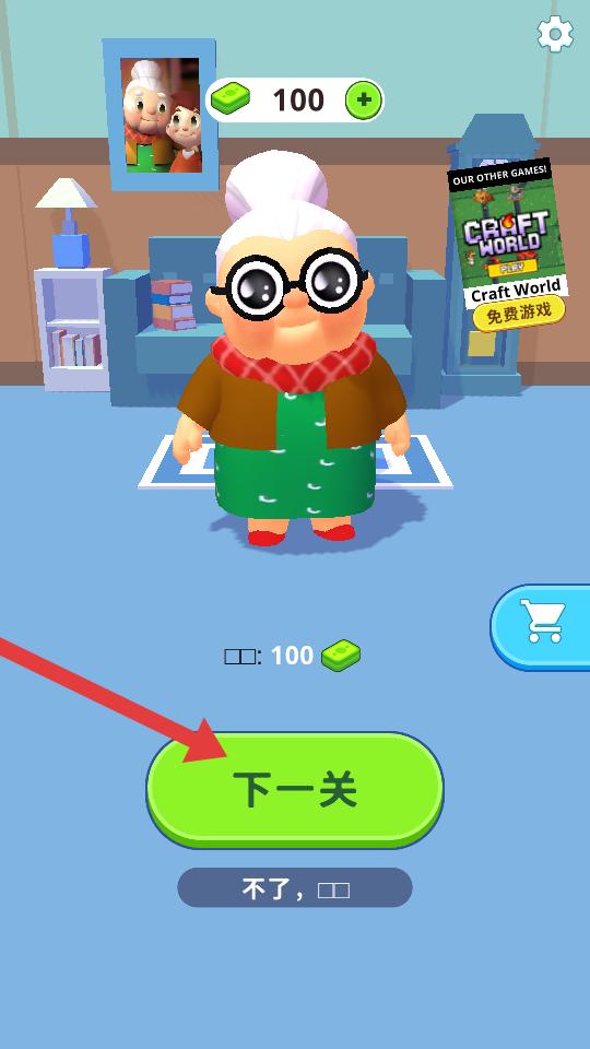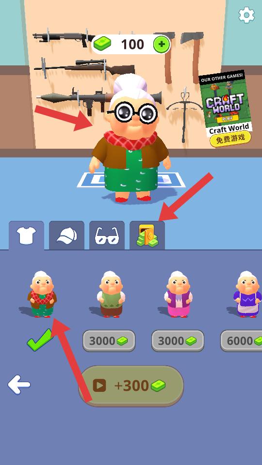 2、在角色或道具界面,可看到不同的奶奶形象和金幣等道具,能選擇喜歡的奶奶形象,也可獲取金幣解鎖更多內(nèi)容。
