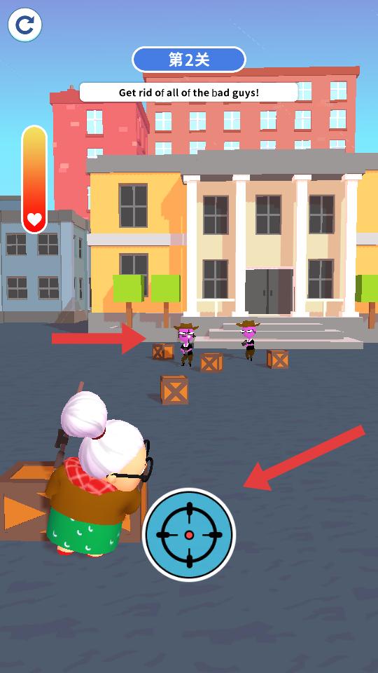 3、進(jìn)入關(guān)卡后,目標(biāo)是消滅所有壞人,操控奶奶移動(dòng),利用瞄準(zhǔn)功能,對(duì)準(zhǔn)壞人,準(zhǔn)備發(fā)起射擊攻擊。