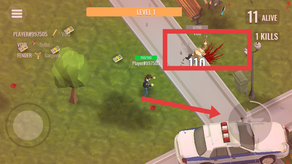 2、進(jìn)入游戲場(chǎng)景后通過屏幕左下方的虛擬搖桿控制角色移動(dòng),靠近敵人后,角色會(huì)自動(dòng)攻擊敵人,擊敗敵人可以獲得分?jǐn)?shù)。