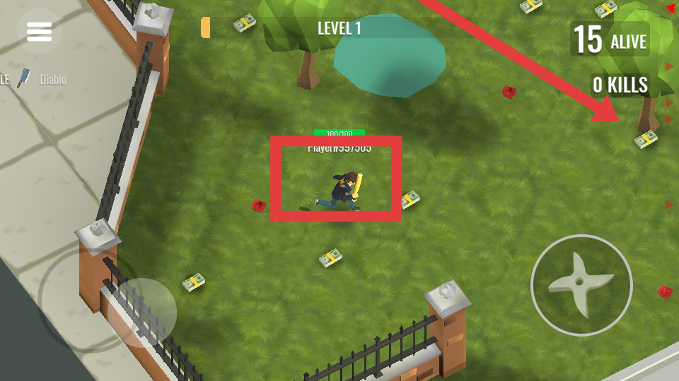 3、在游戲地圖中探索收集如鈔票等資源,這些資源可能可以用于在游戲中購買武器、道具,屏幕右上方會(huì)顯示存活人數(shù)和玩家的擊殺數(shù)。