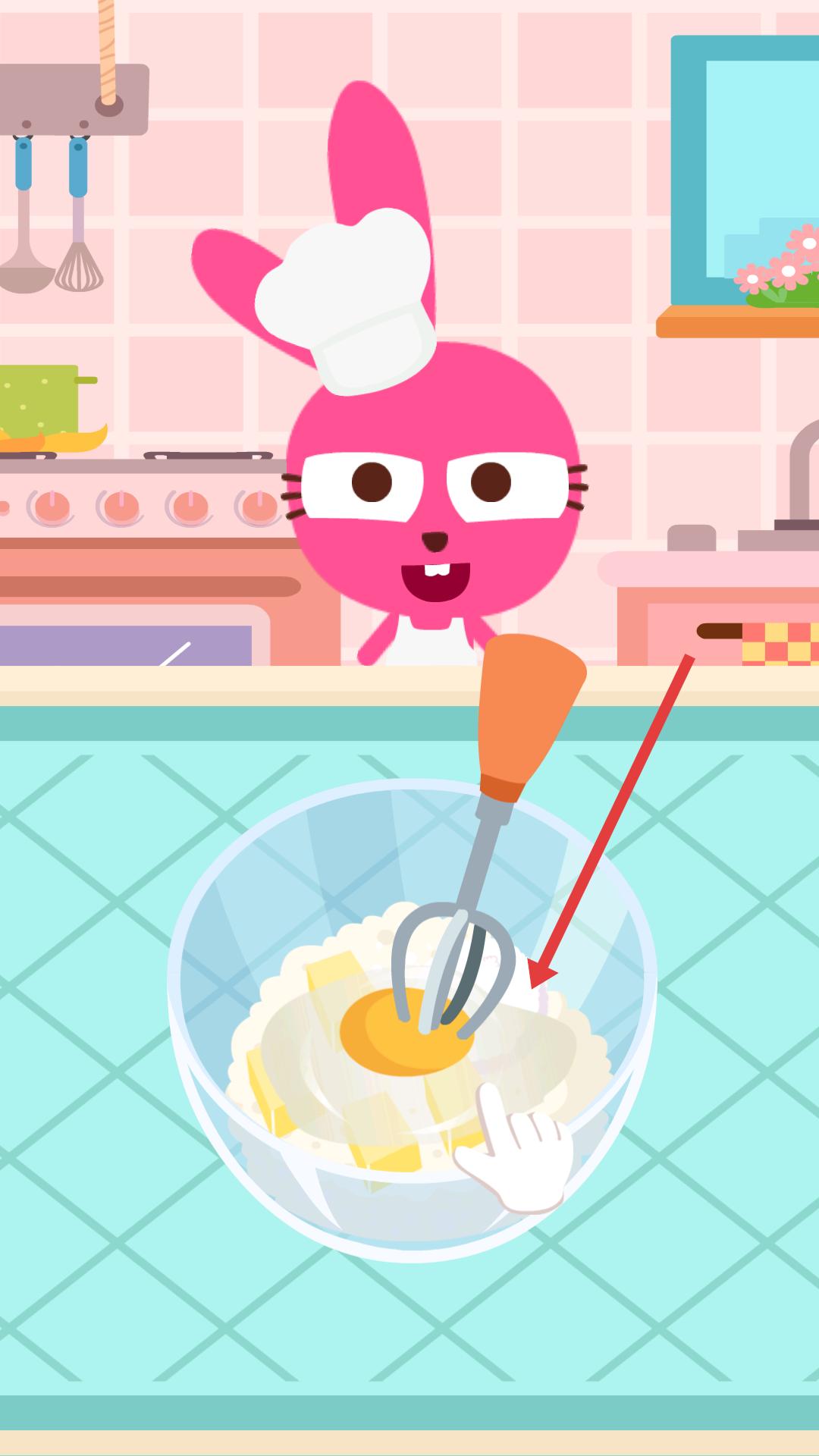 1、進入廚房場景按提示操作,將雞蛋、黃油等食材放入碗中,用攪拌器攪拌均勻,為后續(xù)制作水果派做準備。