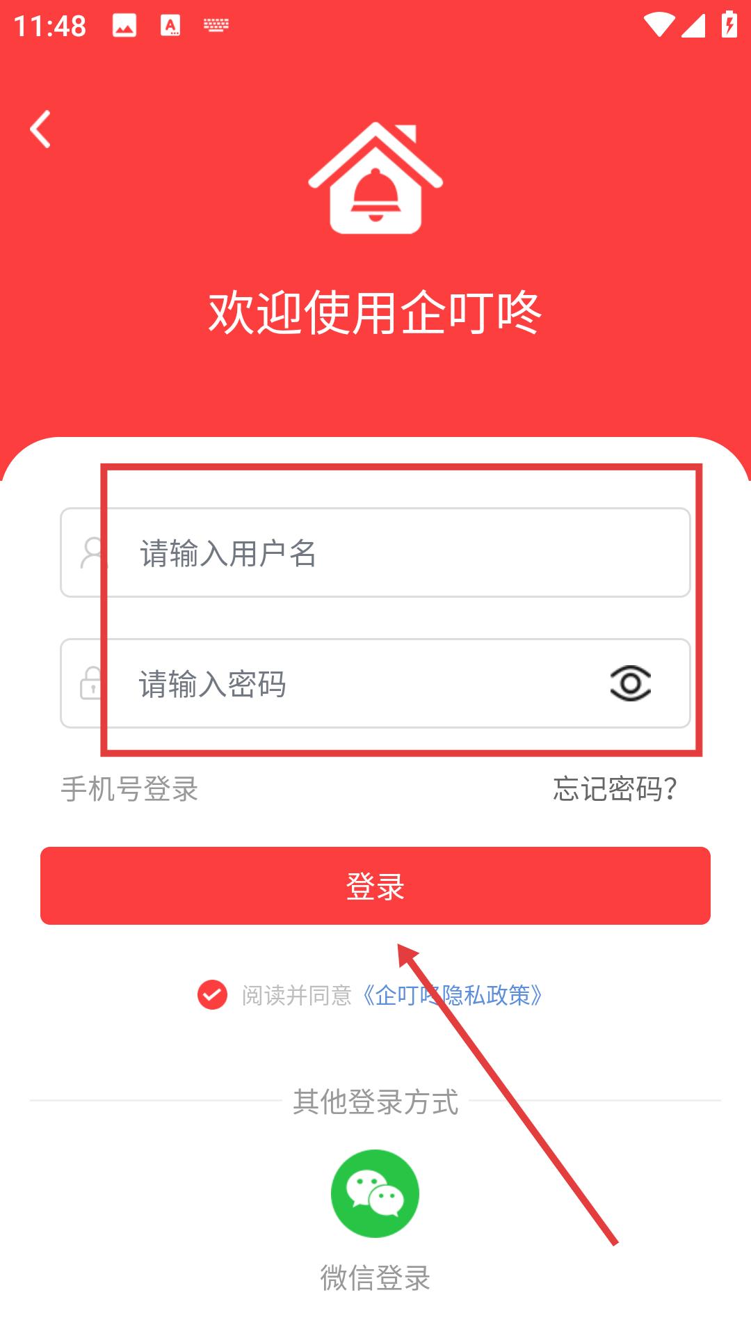 3、在登錄頁面輸入用戶名和密碼,勾選閱讀并同意企叮咚隱私政策,點(diǎn)擊登錄嘗試登錄企叮咚賬號(hào)。