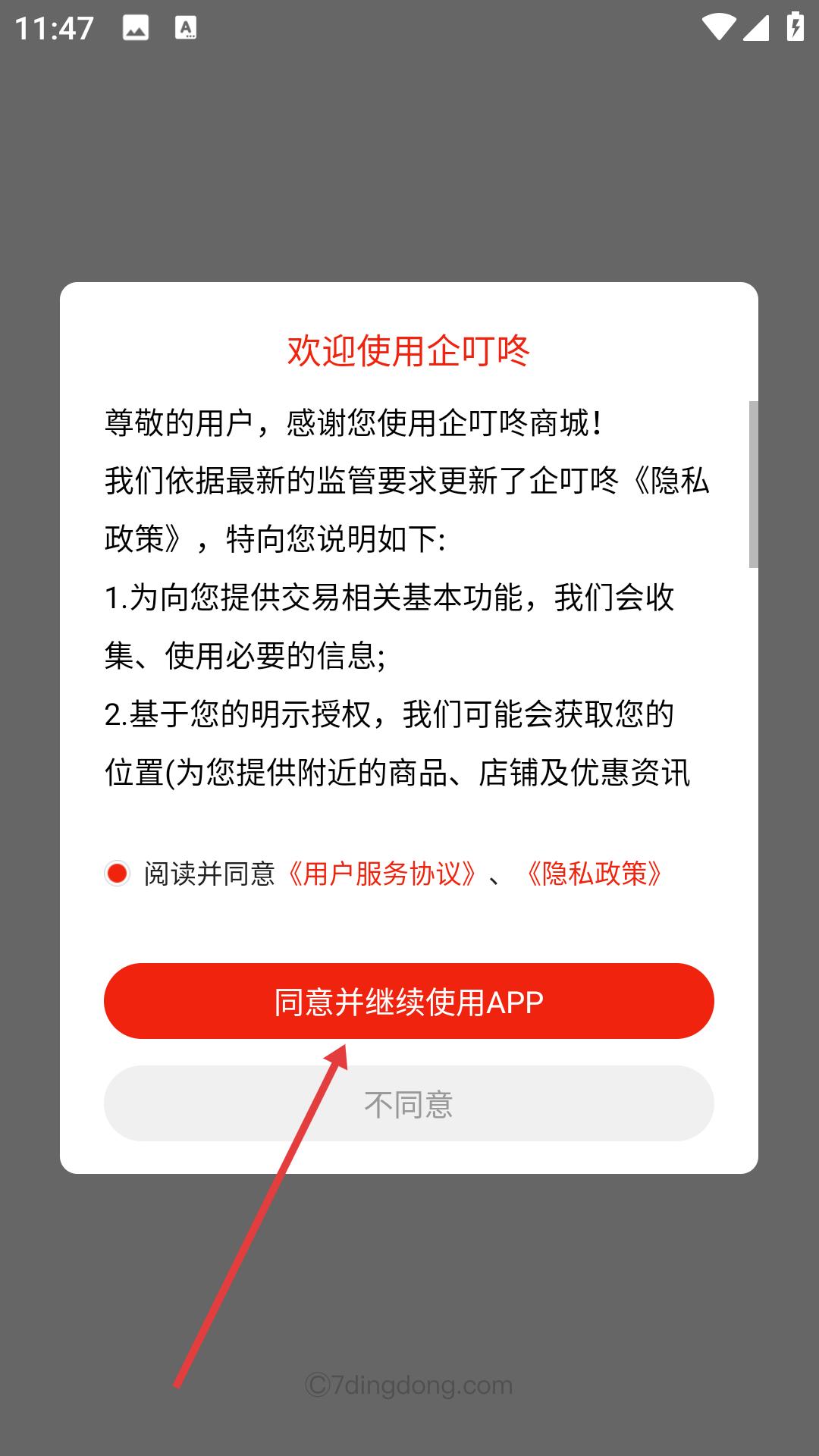 1、進(jìn)入歡迎使用頁面,看到用戶服務(wù)協(xié)議,隱私政策相關(guān)說明,勾選閱讀并同意,點(diǎn)擊同意并繼續(xù)使用APP,進(jìn)入下一步。