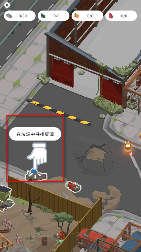 1、在場(chǎng)景中尋找垃圾,根據(jù)提示點(diǎn)擊垃圾,進(jìn)入從垃圾里找資源的環(huán)節(jié),這是獲取建設(shè)材料的重要方式,為后續(xù)建造做準(zhǔn)備。