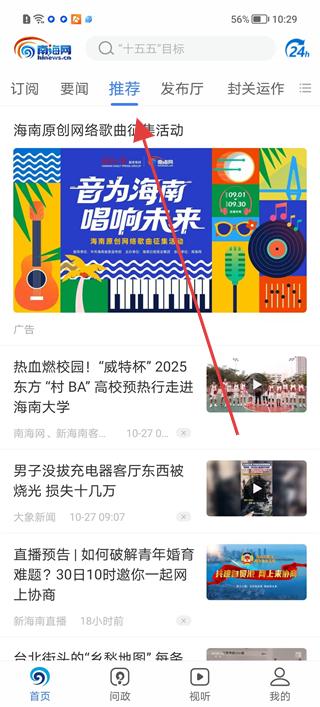 4、切換到推薦頁面查看海南原創(chuàng)網(wǎng)絡(luò)歌曲征集活動、熱血燃校園等新聞,了解海南本地的文化活動與社會新聞,獲取豐富的資訊內(nèi)容。