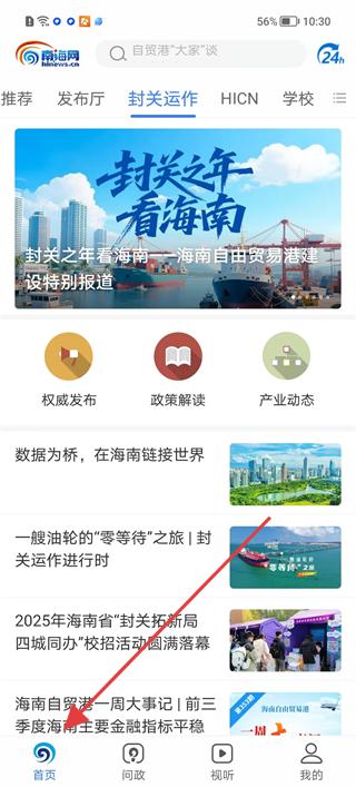 3、切換到首頁瀏覽封關(guān)之年看海南等專題報道,查看權(quán)威發(fā)布、政策解讀等板塊,了解海南自由貿(mào)易港建設(shè)的最新動態(tài)。